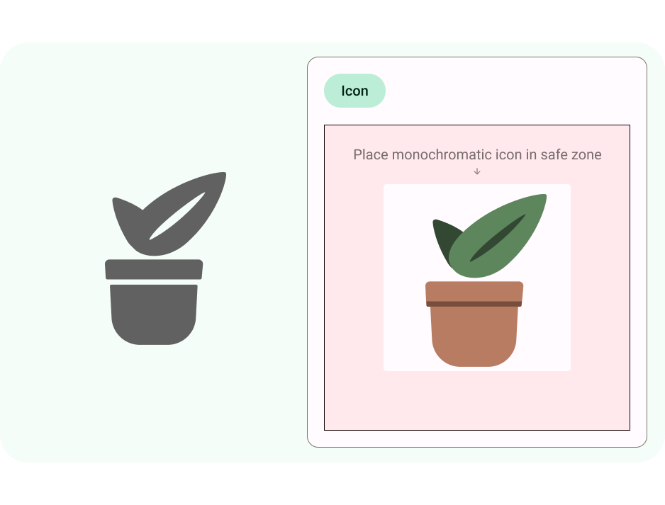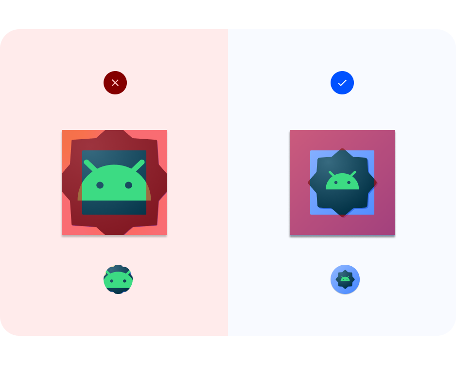 סמל ההתאמה, או AdaptiveIconDrawable, יכול להופיע באופן שונה בהתאם ליכולות של כל מכשיר ולנושא של משתמש. סמלים מותאמים משמשים בעיקר את מרכז האפליקציות במסך הבית, אבל אפשר להשתמש בהם גם בקיצורי דרך, באפליקציית ההגדרות, בתיבות דו-שיח של שיתוף ובמסך הסקירה הכללית.