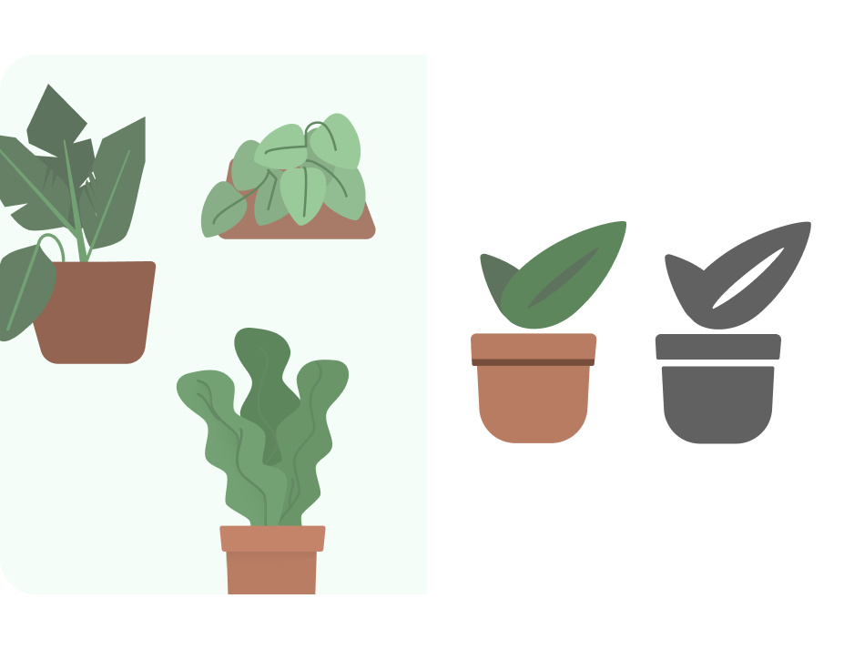 - אם אין לכם סמל מונוכרומטי, מתחילים עם לוגו או סמל שקשורים לאפליקציה. כדאי לעיין בטיפים לעיצוב כדי לעדכן את הסמל. ראשית, פישוט של צורות מורכבות והימנעות מהן. לדוגמה, כאן מוצגים איורים בתוך האפליקציה בצורה פשוטה יותר, עם צורות עלים פחות מורכבות. צלליות ופרטי קווים מדומים עם רווח לבן.