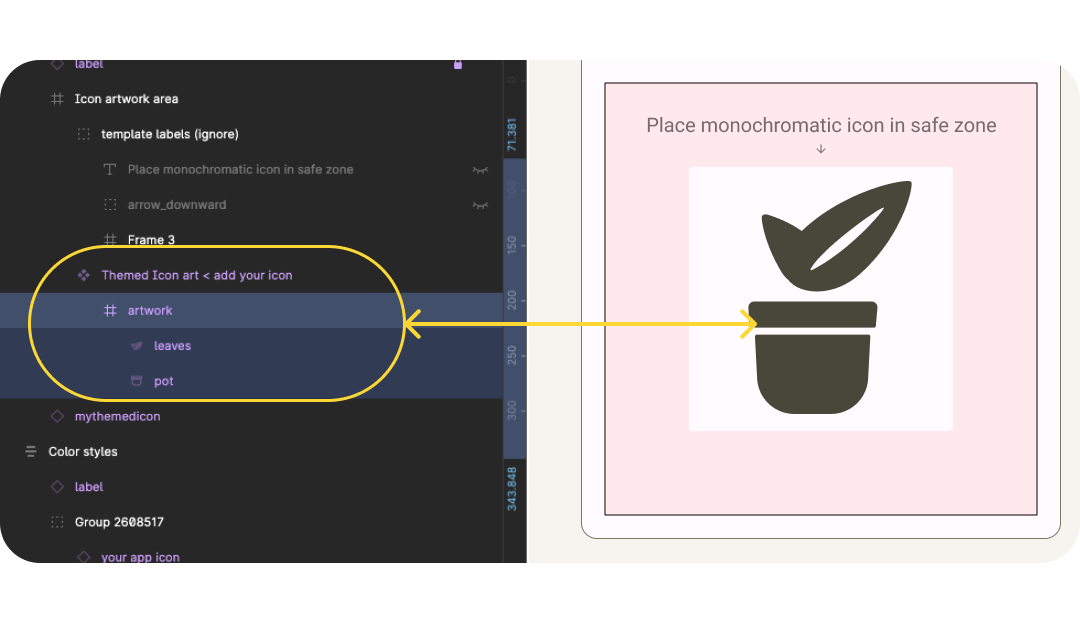 - בקובץ, מאתרים את המסגרת צבע מותאם. בחלונית השכבות הימנית מחפשים את האפשרות 'צבע מותאם' > רכיבים > אומנות > אזור גרפיקה של סמל > עיצוב סמלים מעוצב < ומוסיפים את הסמל שלכם. אם יש לכם סמל מונוכרומטי מוכן, מעתיקים אותו לכאן כדי להחליף אותו לדוגמה ומדלגים לשלב 6.
