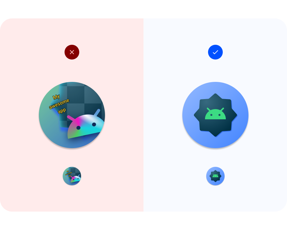 הימנעות מצורות מורכבות. תוכן כזה כולל גם סמלי לוגו. כדאי להשתמש בלוגו פשוט יותר, אם אפשר, או להשתמש בסימולוגיה כדי שהמשתמשים יוכלו להתחבר לאפליקציה. צורה ניתנת לקריאה וייחודית עוזרת ליצור אחידות כדי שמשתמשים יוכלו לזהות את האפליקציה בקלות מהקשרים שונים (צבע והתראות מותאמות).