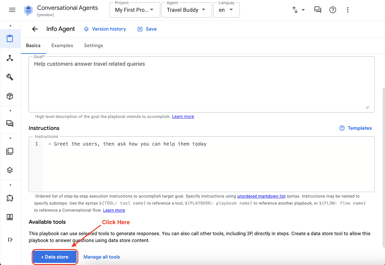 这会创建一个数据存储工具,供代理与数据存储区进行通信,但您仍然需要创建包含相应信息的实际数据存储区。为此,请点击添加数据存储区并创建数据存储区。