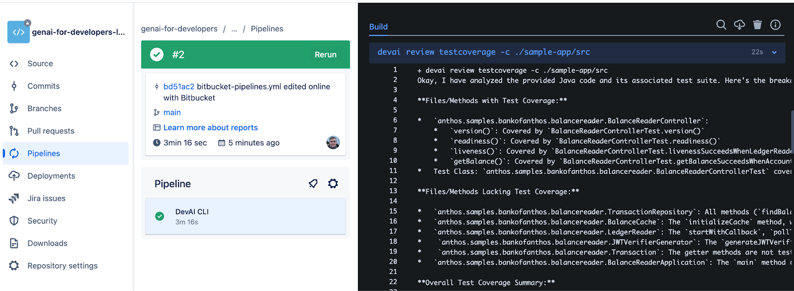 devai review testcoverage -c ~/bitbucket/genai-for-developers/sample-app/src > testcoverage.md