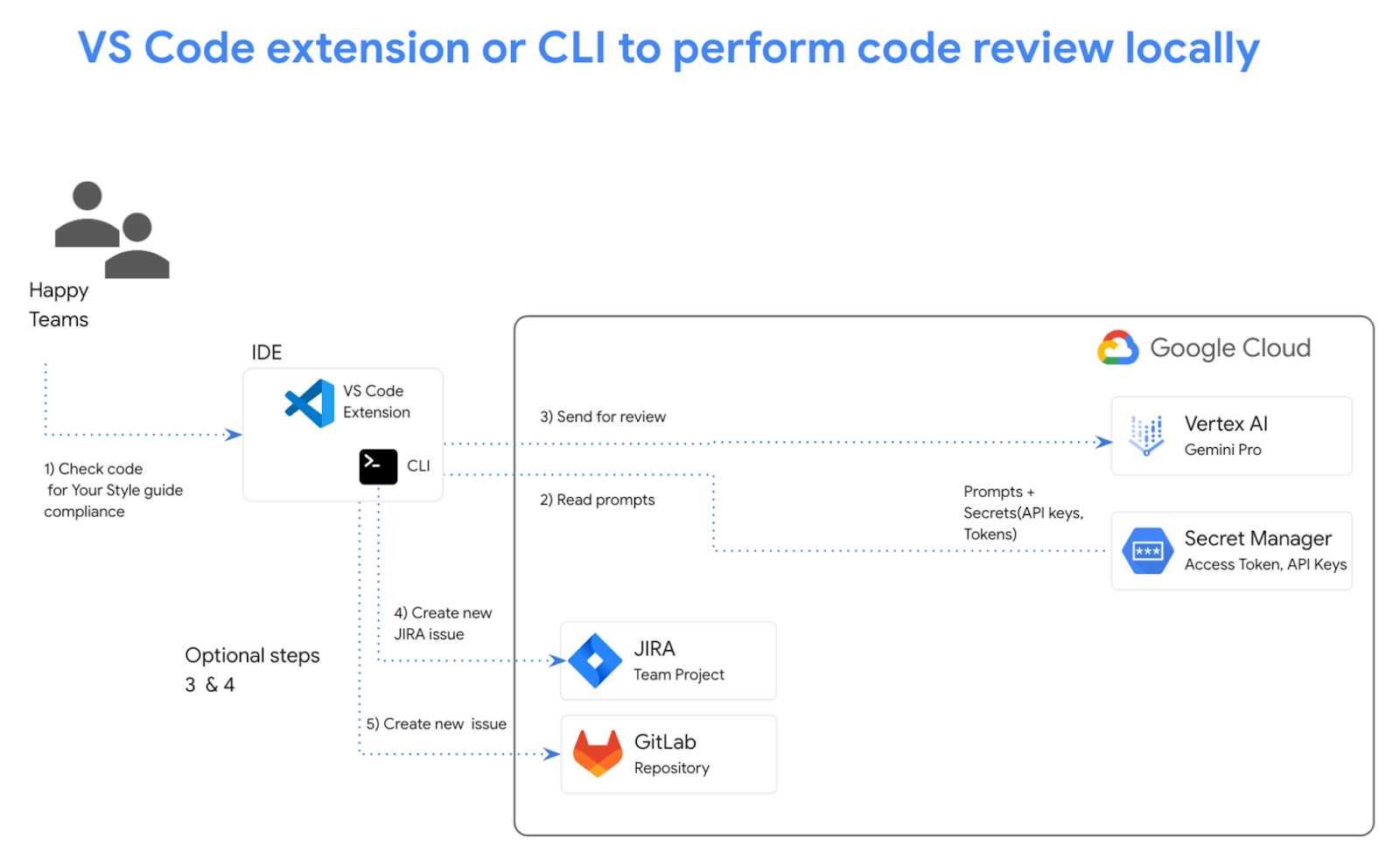 The diagram outlines a process for conducting local code reviews using a VS Code extension or CLI, leveraging Google Cloud's Vertex AI (Gemini Pro) for generating review prompts.