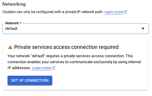 - 然后,选择“使用自动分配的 IP 范围”,然后点击“继续”。查看相关信息后,选择“创建连接”。