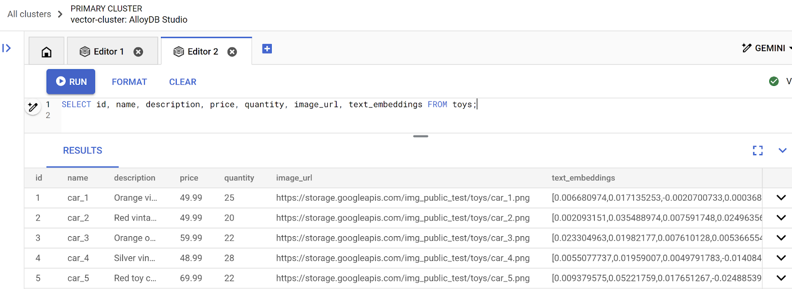 再次查看 toys 表可看到一些嵌入。请务必重新运行 SELECT 语句以查看更改。