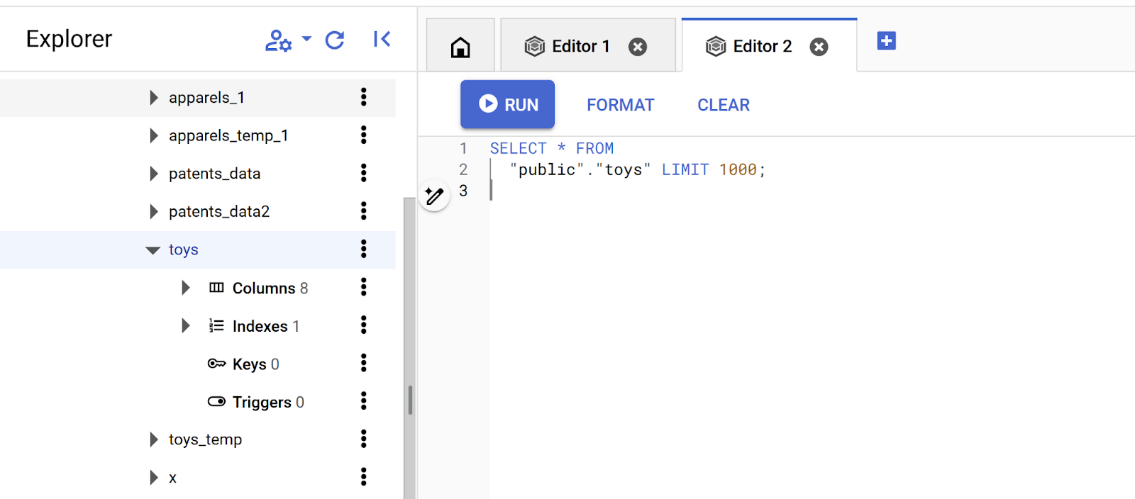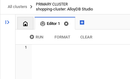 您可以在编辑器窗口中输入 AlloyDB 的命令,根据需要使用“Run”、“Format”和“Clear”选项。