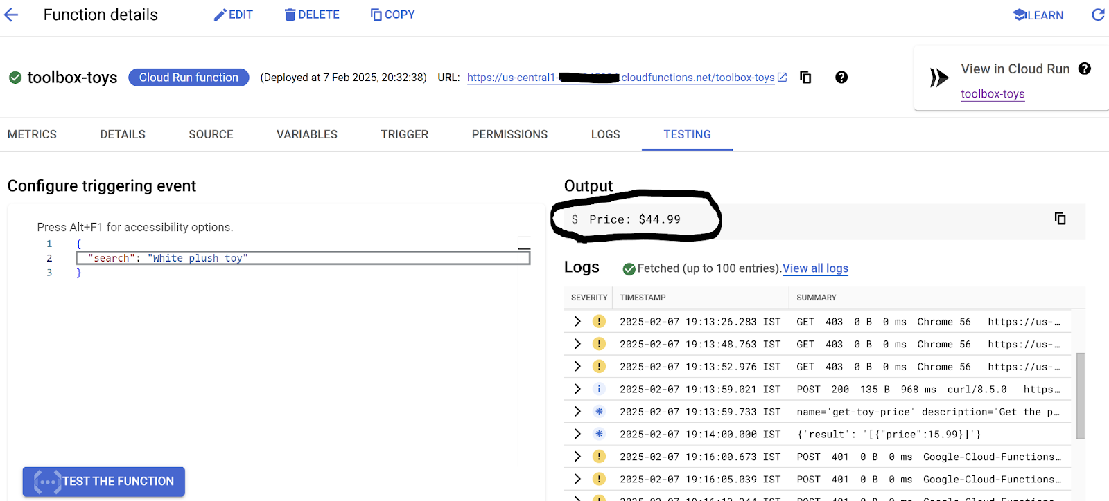 - 部署该函数,您将获得一个 REST 端点,以便在 toystore Web 应用中访问价格预测工具。