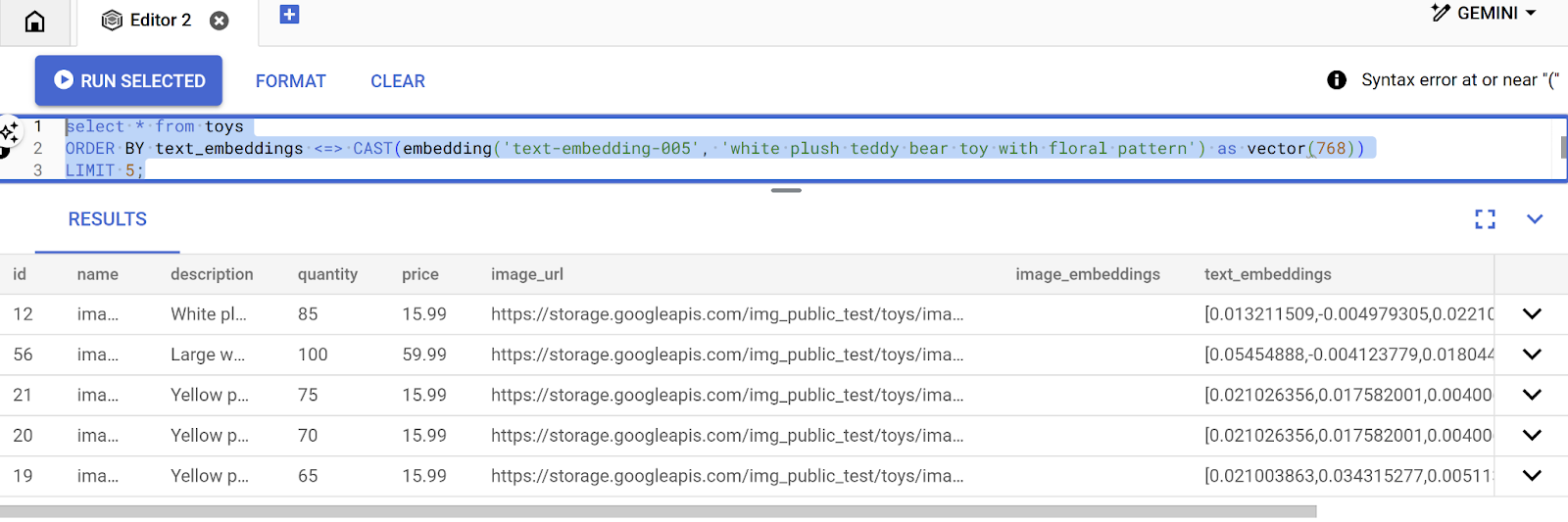 UPDATE toys set text_embeddings = embedding( 'text-embedding-005', description);