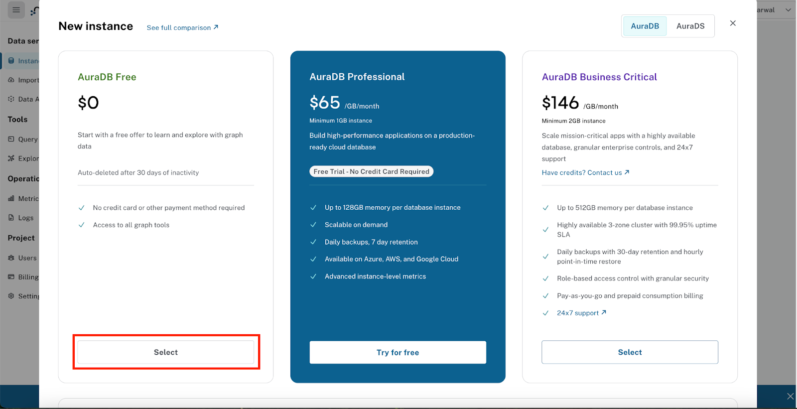 Bu codelab'de, AuraDB'nin ücretsiz katmanı olan Neo4j AuraDB Free'i kullanacağız. Prototip oluşturma, öğrenme ve küçük uygulamalar geliştirme için yeterli depolama alanı ve özelliklere sahip, tümüyle yönetilen bir grafik veritabanı örneği sağlar. Bu, üretken yapay zeka destekli bir film önerisi sohbet robotu oluşturma hedefimiz için mükemmel bir seçimdir.