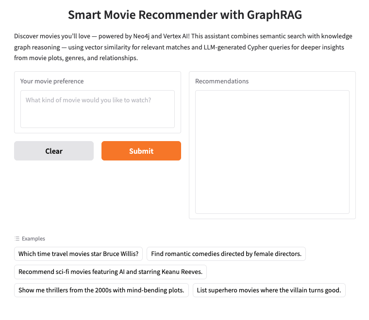 您已成功使用 Neo4j、Vertex AI 和 Gemini 建構並部署以 GraphRAG 為基礎、增強了生成式 AI 的電影推薦聊天機器人。結合 Neo4j 的圖形原生建模功能、透過 Vertex AI 進行語意搜尋,以及透過 Gemini 進行自然語言推理,您就能建立超越基本搜尋的智慧系統,瞭解使用者意圖、根據連結資料推理,並以對話方式回覆。