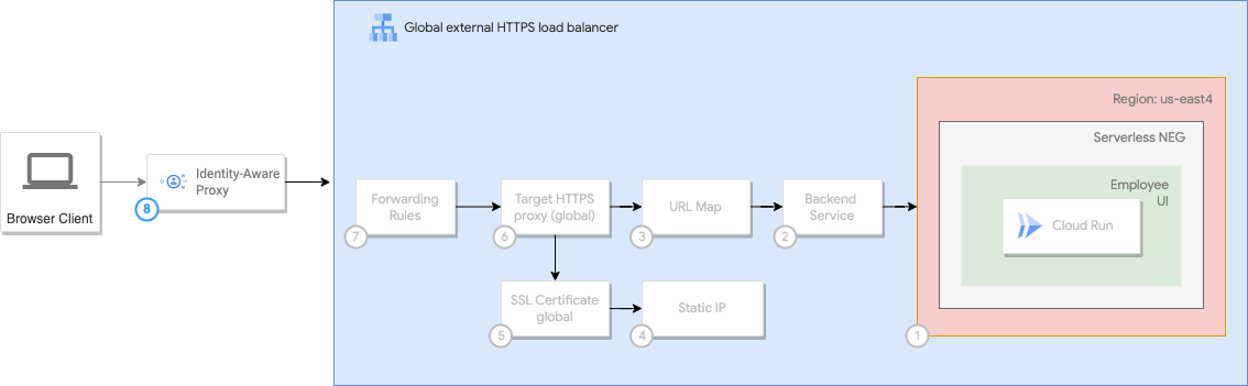 您将为员工界面 Cloud Run 服务创建一个无服务器网络端点组(无服务器 NEG)。借助无服务器 NEG,您可以将 Google Cloud 无服务器应用与外部 HTTP(S) 负载均衡搭配使用。