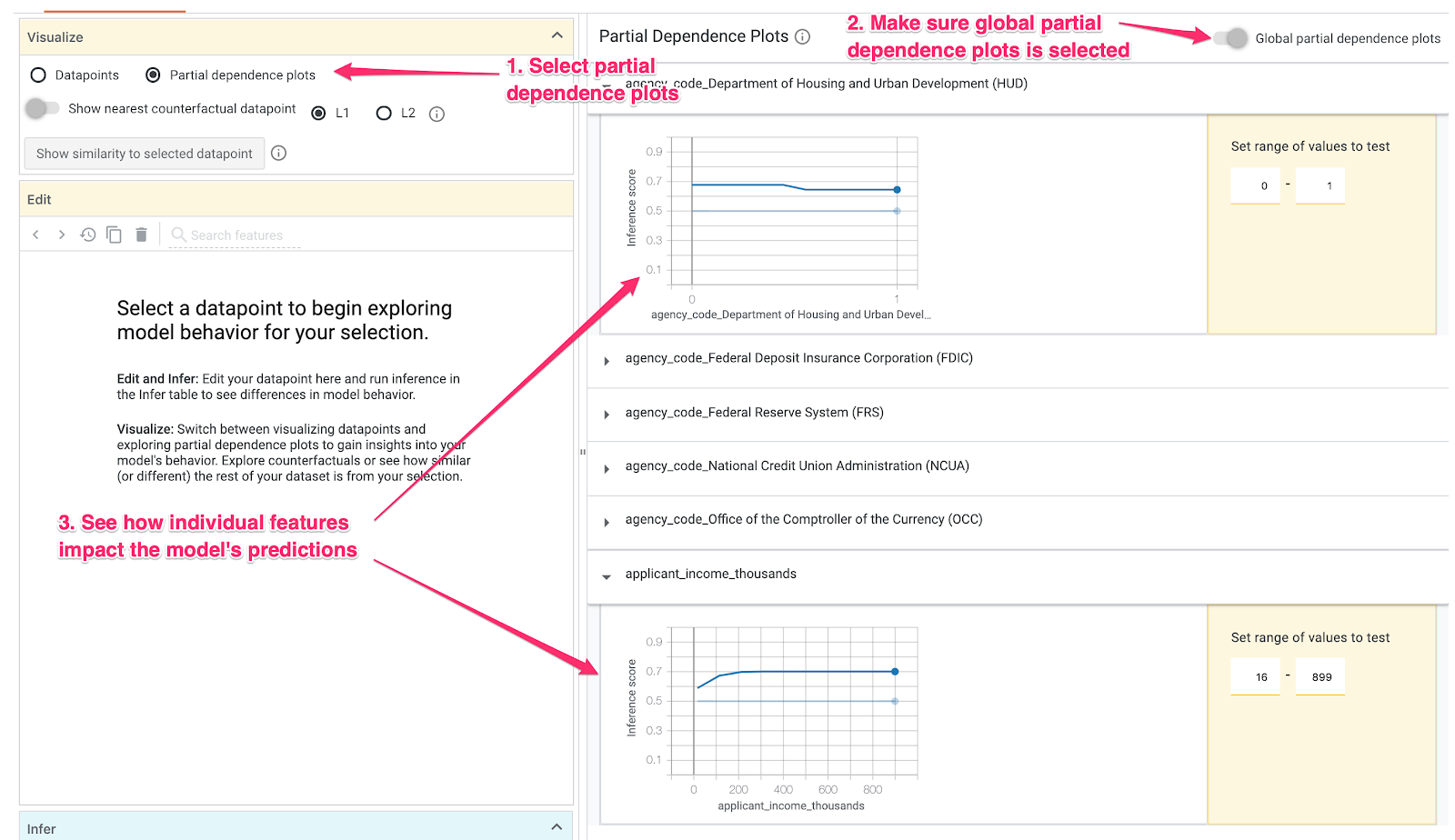 To see how each feature affects the model's predictions overall, check the Partial dependence plots box and make sure Global partial dependence plots is selected: