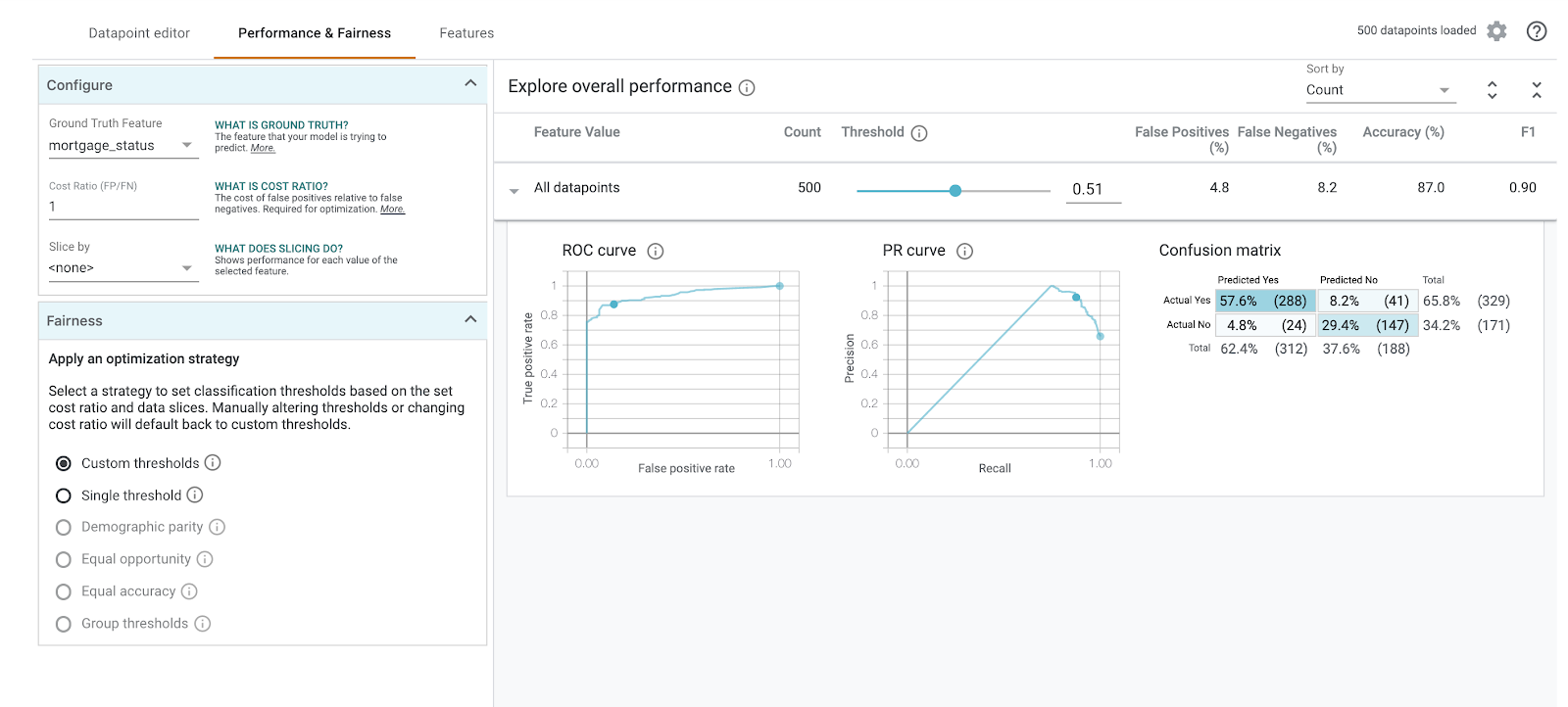 Next, go to the Performance & Fairness tab. This shows overall performance statistics on the model's results on the provided dataset, including confusion matrices, PR curves, and ROC curves.