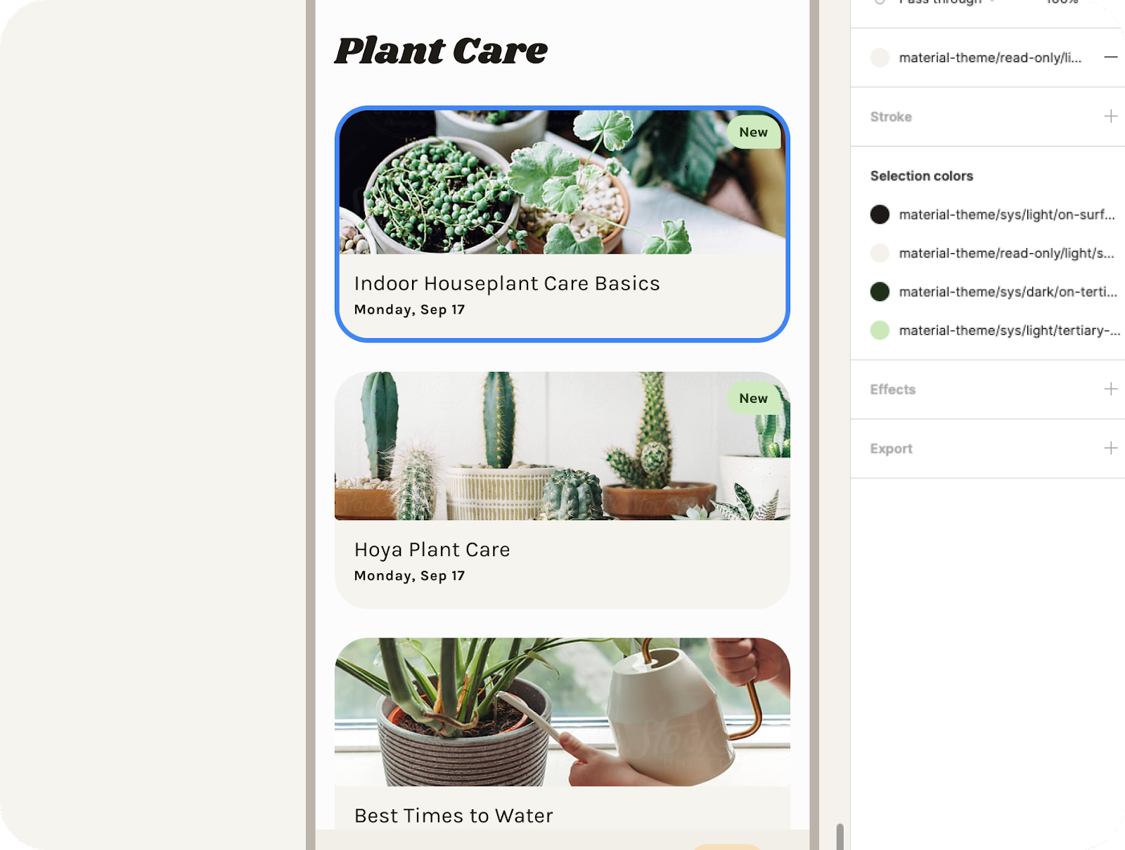 - 選取文章資訊卡。在填滿中,將樣式 (四個點圖示) 設為 material-theme/surface。(你也可以搜尋活動平台)。